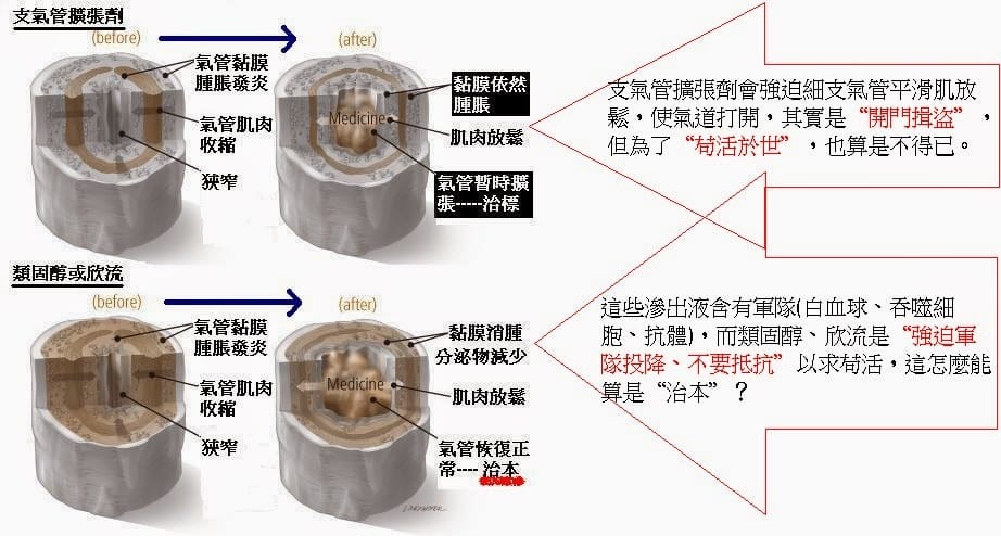 多數氣喘醫師主張:「氣喘治療有兩法寶——氣管擴張劑與類固醇(或欣流)。」但實際上,這些藥都是緊急的權宜之策,僅為救命而設,與「治本」無關。在氣喘發作時使用擴張劑或類固醇,就像是「為活命而暫時求和」,而不是恢復國防力量。